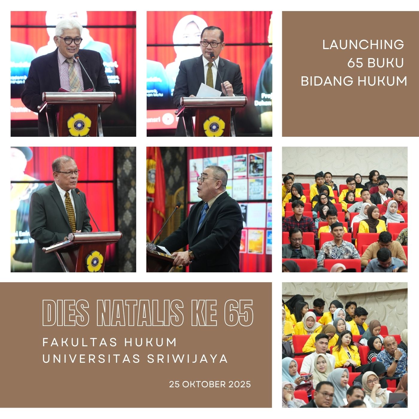 Palembang, 25 Oktober 2025 — Dalam rangka memperingati Dies Natalis Ke-65 Fakultas Hukum Universitas Sriwijaya (FH Unsri), digelar Pidato Ilmiah dan Launching 65 Buku Bidang Hukum bertema “65 Tahun Berperan Strategis dalam Pembangunan Hukum Indonesia” pada Sabtu, 25 Oktober 2025, bertempat di Ruang Prof. Amzulian Rifai, S.H., LL.M., Ph.D. Hall, FH Tower Lantai 8, Kampus Palembang.