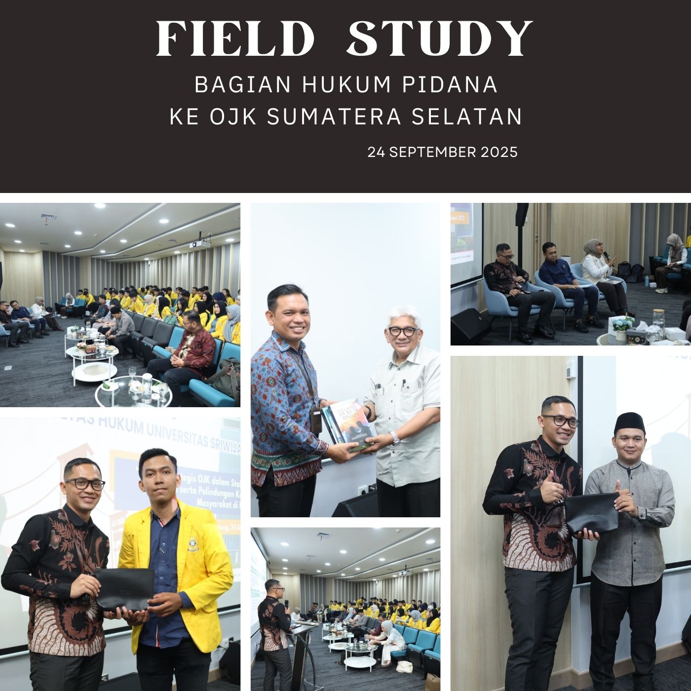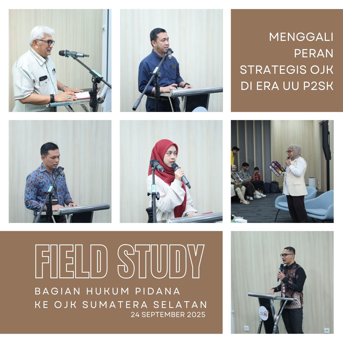 Palembang, 24 September 2025 – Dalam rangka memperingati Dies Natalis ke-65, Fakultas Hukum Universitas Sriwijaya (FH Unsri) melalui Bagian Hukum Pidana melaksanakan kegiatan Field Study ke Otoritas Jasa Keuangan (OJK) Provinsi Sumatera Selatan. Kegiatan yang berlangsung di Gedung OJK Sumatera Selatan ini mengusung tema “Peran Strategis OJK dalam Stabilitas Sistem Keuangan serta Perlindungan Konsumen dan Masyarakat di Era UU P2SK.”